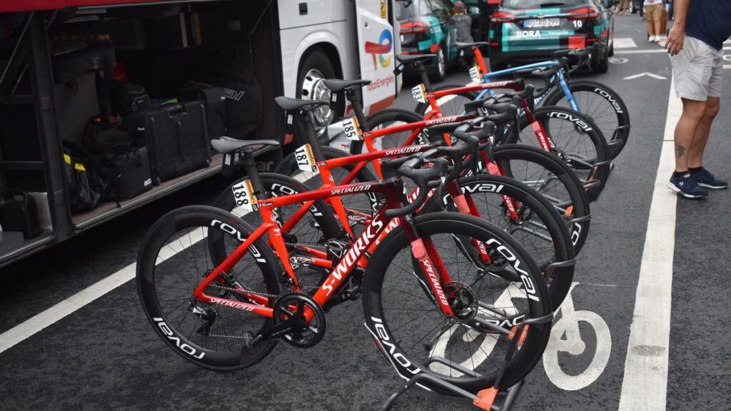 Les vélos professionnels du Tour de France coûtent entre 9 000 € et 20 000 €, avec des modèles d’exception comme le Pinarello Bolide F, utilisé par Ineos Grenadiers, estimé à 45 200 €. Le Specialized S-Works Tarmac SL8 de Soudal-QuickStep s’élève à 15 700 €, tandis que le Van Rysel RCR-R de Decathlon–AG2R La Mondiale, l’un des plus abordables, est facturé 8 198,99 €. Ces chiffres excluent les ajustements sur mesure, tels que les selles ou potences imprimées en 3D, qui alourdissent la facture de plusieurs milliers d’euros. Chaque coureur dispose de 3 à 4 vélos pour affronter les étapes variées (montagne, plaine, contre-la-montre), représentant un investissement global de 12 millions d’euros en matériel pour l’ensemble des équipes en 2023.
